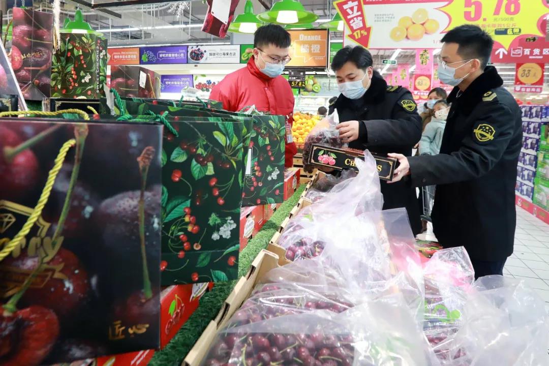 ▲1月17日,执法人员正在超市对年货市场进行检查。陈洁/图