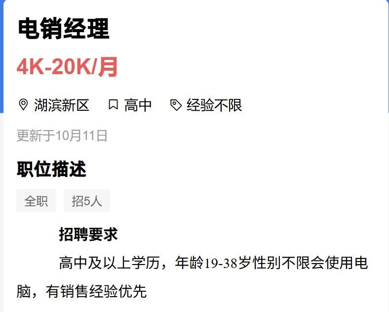 02 招聘岗位-电销经理 招聘要求:高中及以上学历,年龄19-38岁性别不限会使用电脑,有销售经验优先。 其他福利:带薪年假,带薪培训,生日福利,团建活动,新人补贴。 薪酬待遇:五险险一金、免费班车、住宿补贴、高温补贴、过节费、节日福利、项目奖金。 综合薪资:4000-20000上不封顶 招聘人数:5人