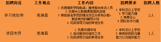 北京中公教育科技有限公司芜湖分公司于2011年成立,先后在芜湖地区成立了5个学习中心。(安师大、无为、芜湖县、南陵县、繁昌县)。为了更好的服务于学员、回馈社会,同时加强芜湖分部内部人才T队建设,现在面向社会和各大高校广纳优秀人才,公示如下:
